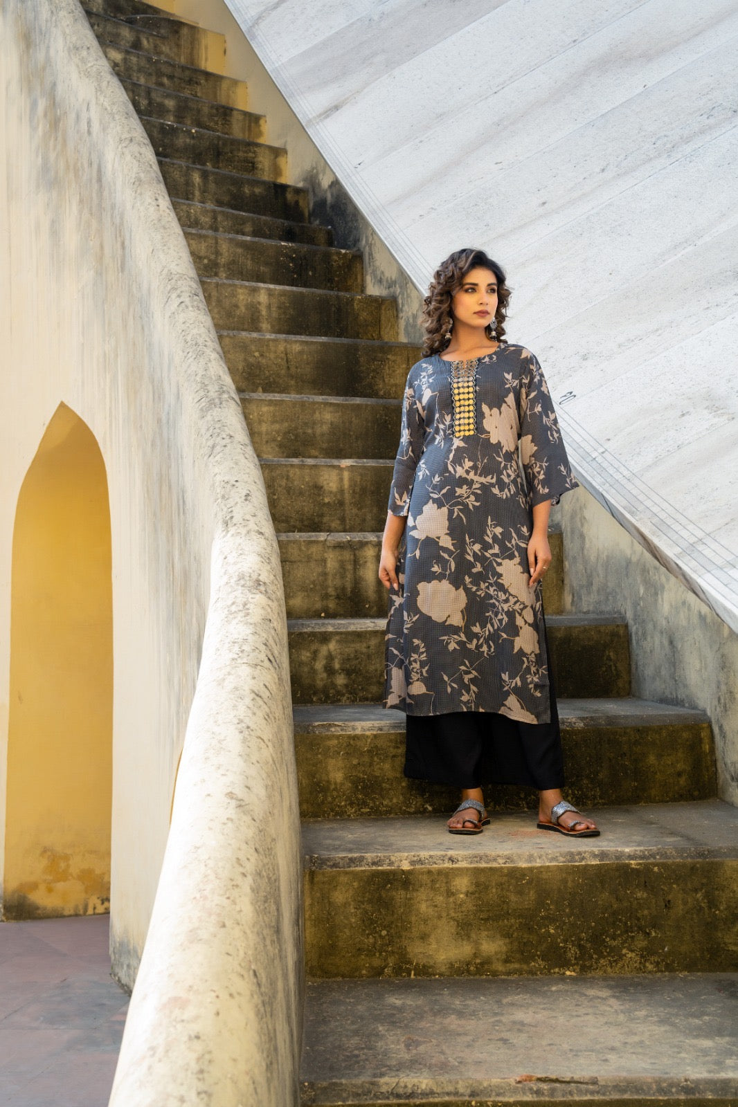Elevate your everyday style with this Black Palazzo Set, featuring a kurta adorned with delicate golden coin accents on the neckline and subtle white motifs across the body. Paired with sleek solid-black palazzo pants, the look is refined, airy, and effortlessly striking.