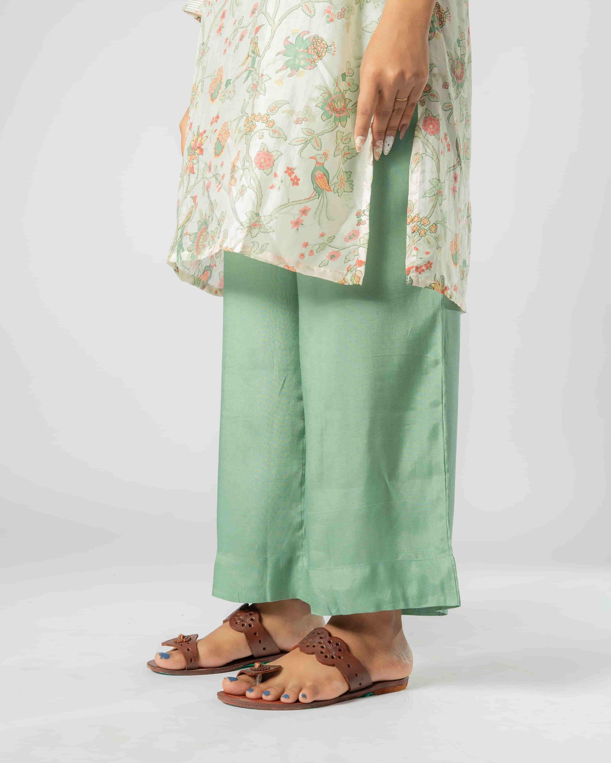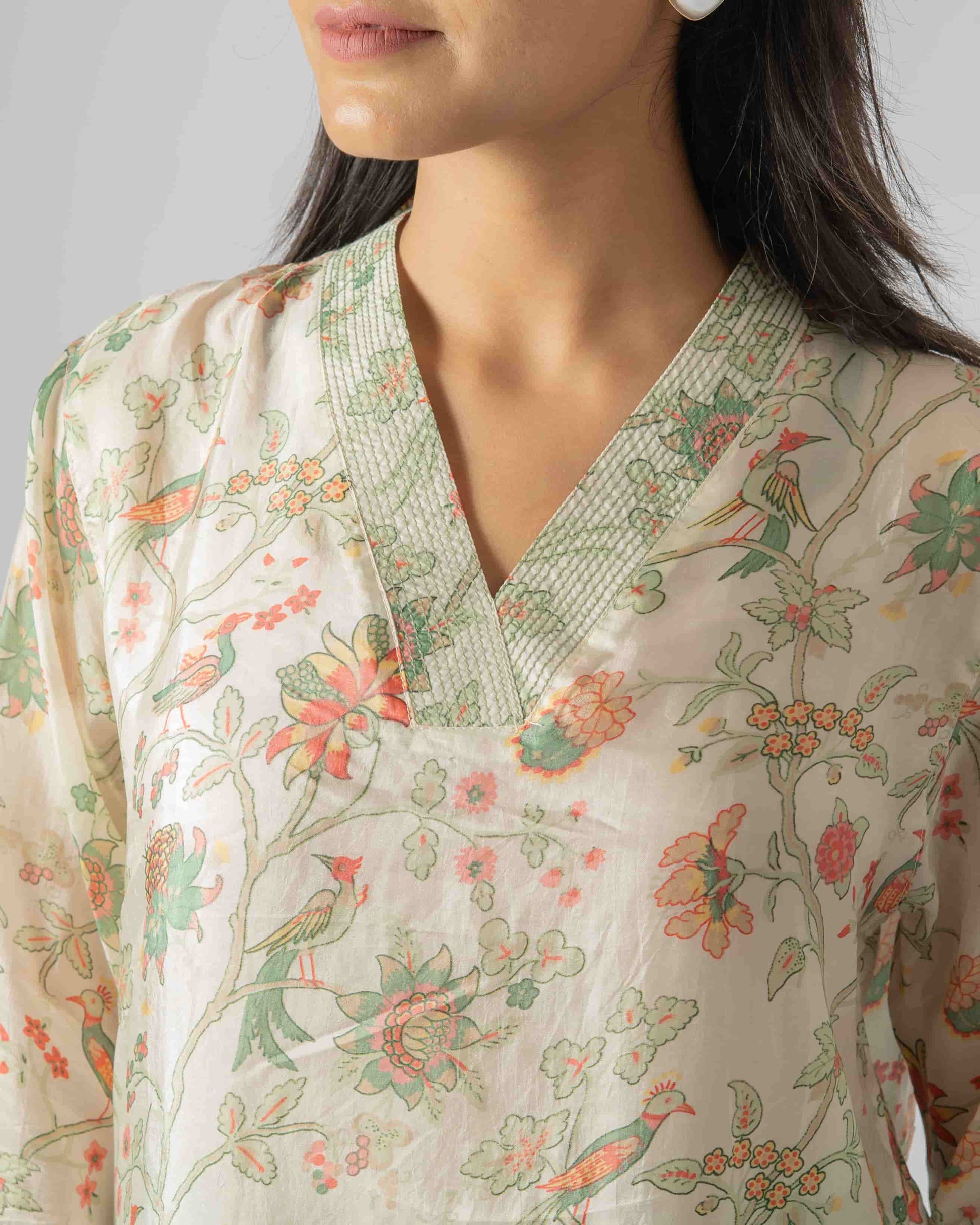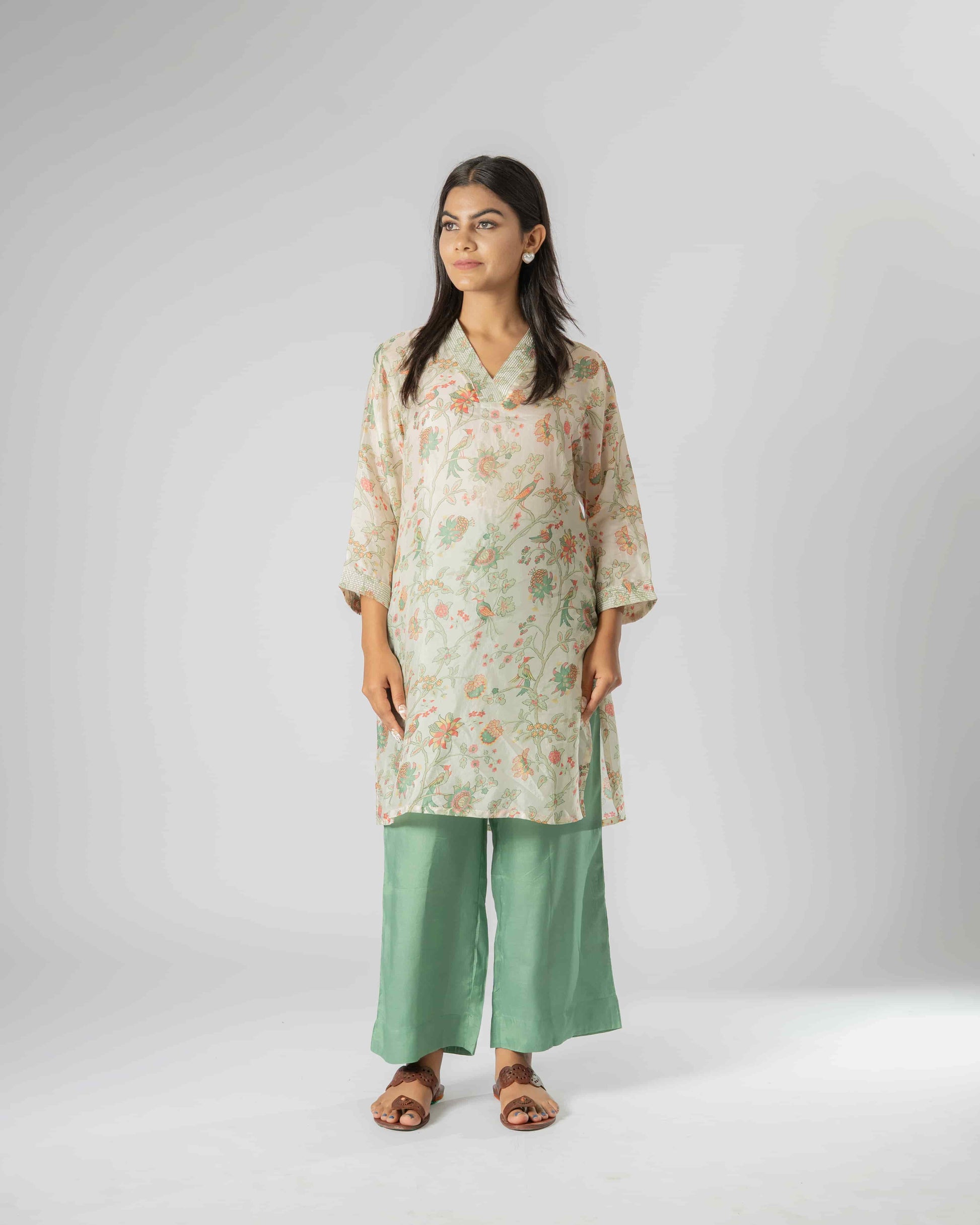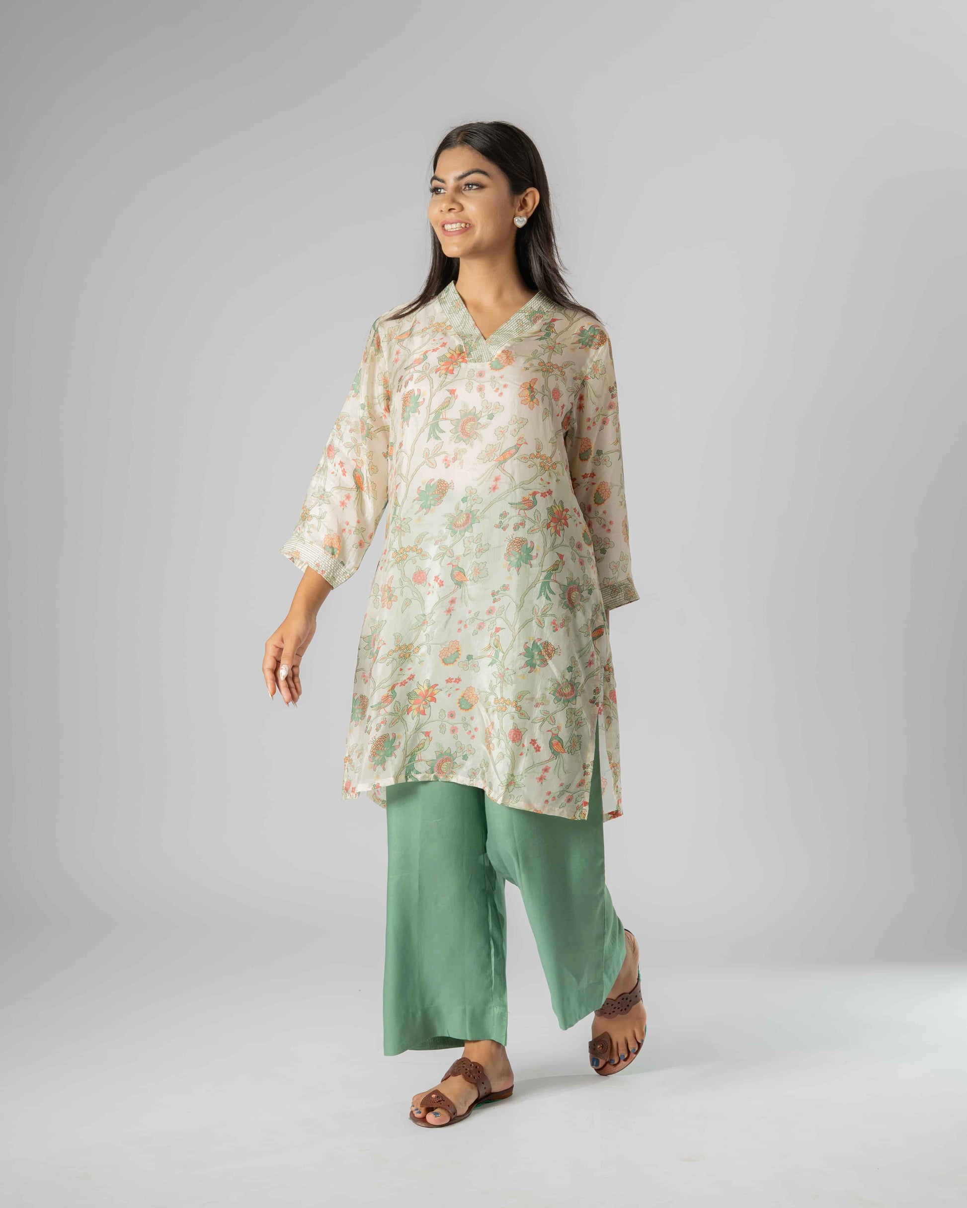 Soft as a whisper, this very light cream coord set with green motifs brings comfort and charm together. Paired with pants, it’s easy, breezy, and perfect for laid-back days with a touch of elegance.