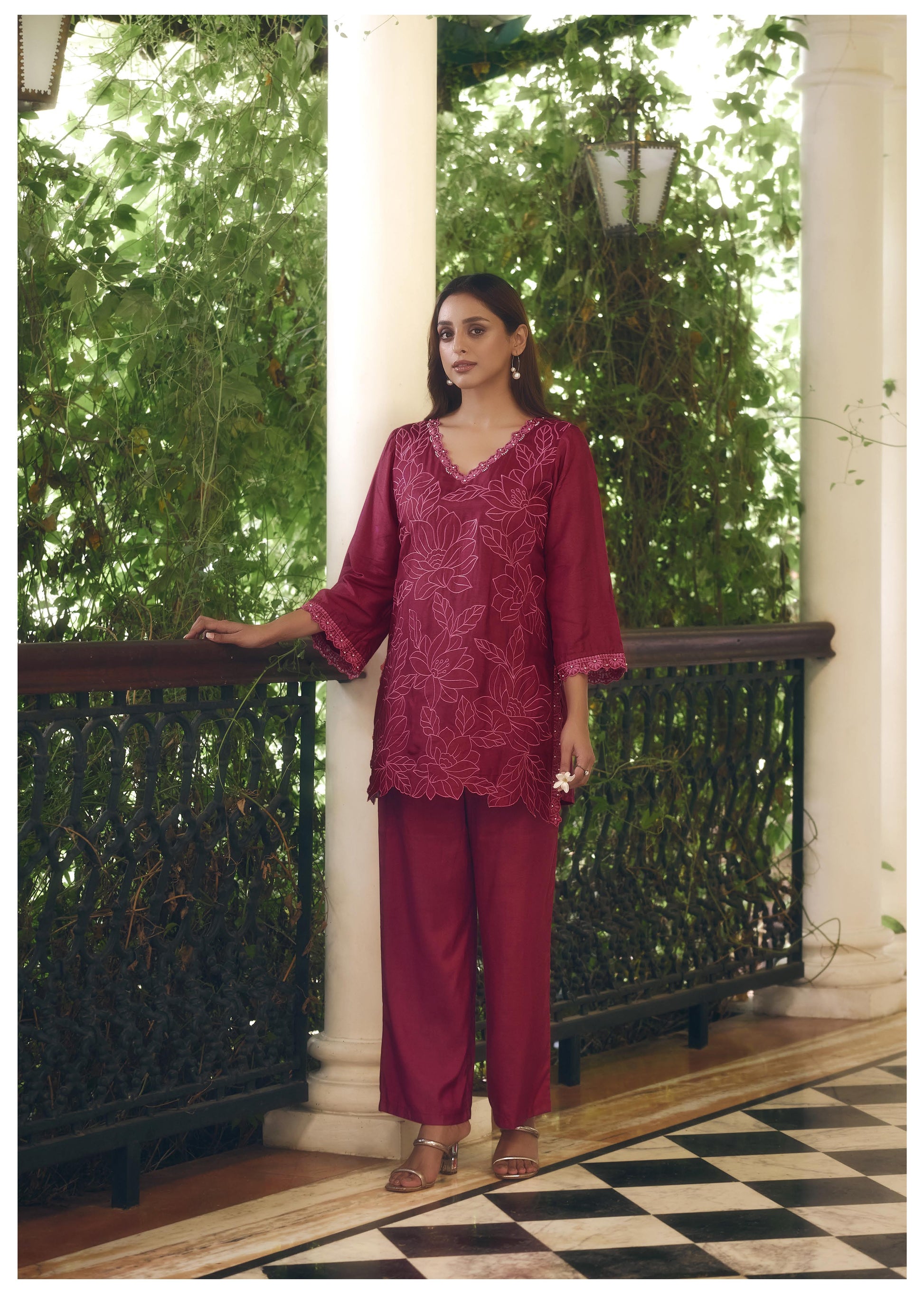 A rich maroon kurta-style co-ord set crafted in soft, breathable fabric and detailed with elegant threadwork on the neckline, sleeves, and hem. Effortlessly polished and beautifully understated, this set strikes the perfect balance between everyday sophistication and festive charm.