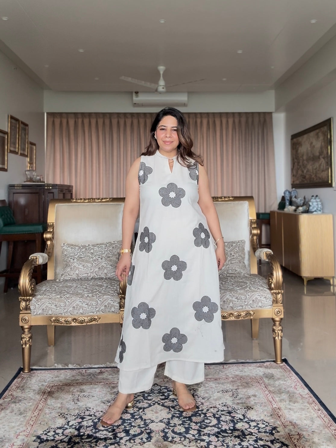 Effortless style meets timeless contrast in our Monochrome Bloom Co-ord Set. Crafted in breathable flex cotton, this sleeveless white ensemble is adorned with delicate black floral embroidery, creating a striking yet elegant look. The coordinated top and pants offer a relaxed fit, perfect for brunch dates, summer outings, or casual office days.