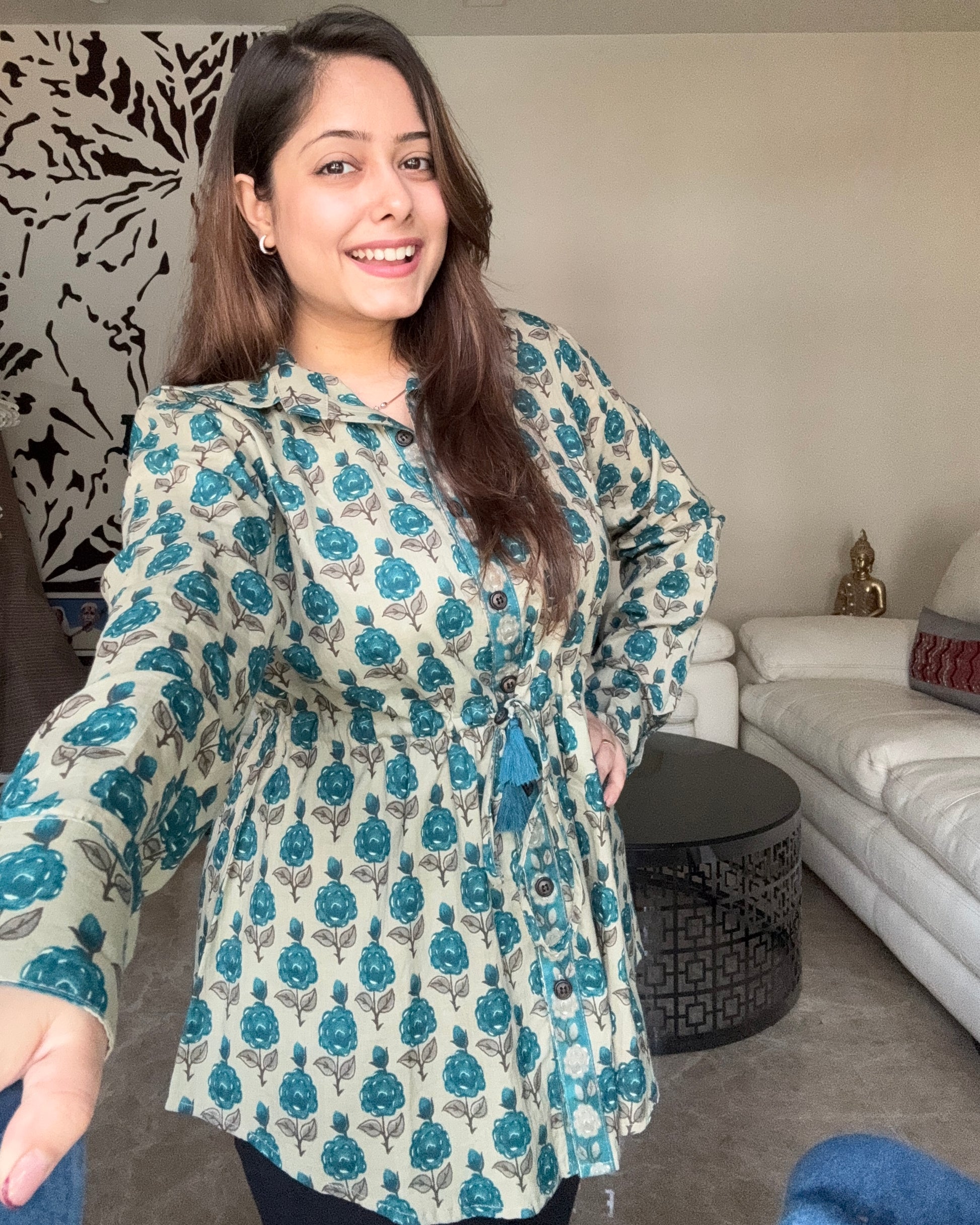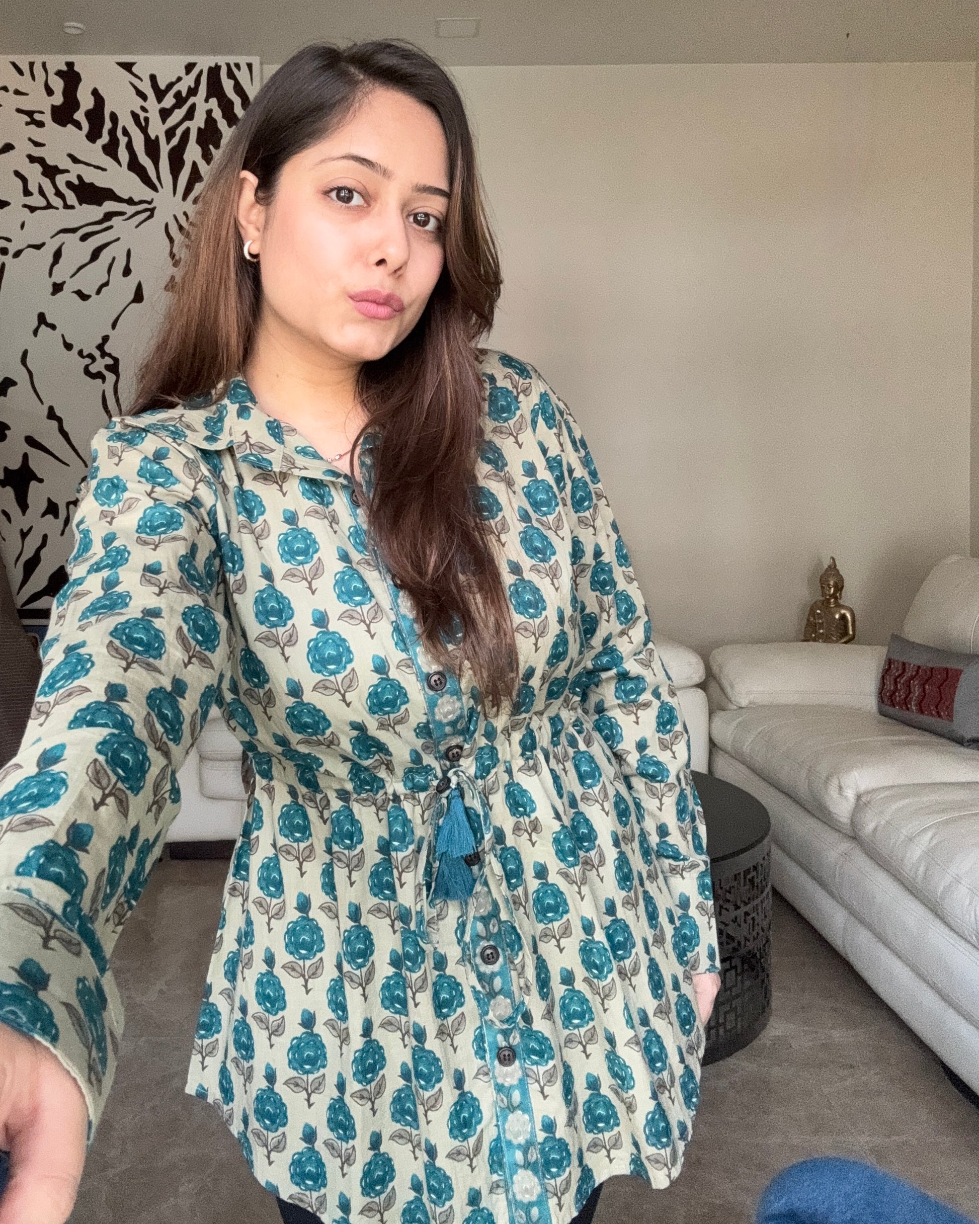 Playful yet polished – this rose-printed shirt in soothing blue-green hues features a flattering tie detail at the waist. Made in breathable fabric with a soft fall, it’s your perfect pick for a relaxed yet chic everyday look.