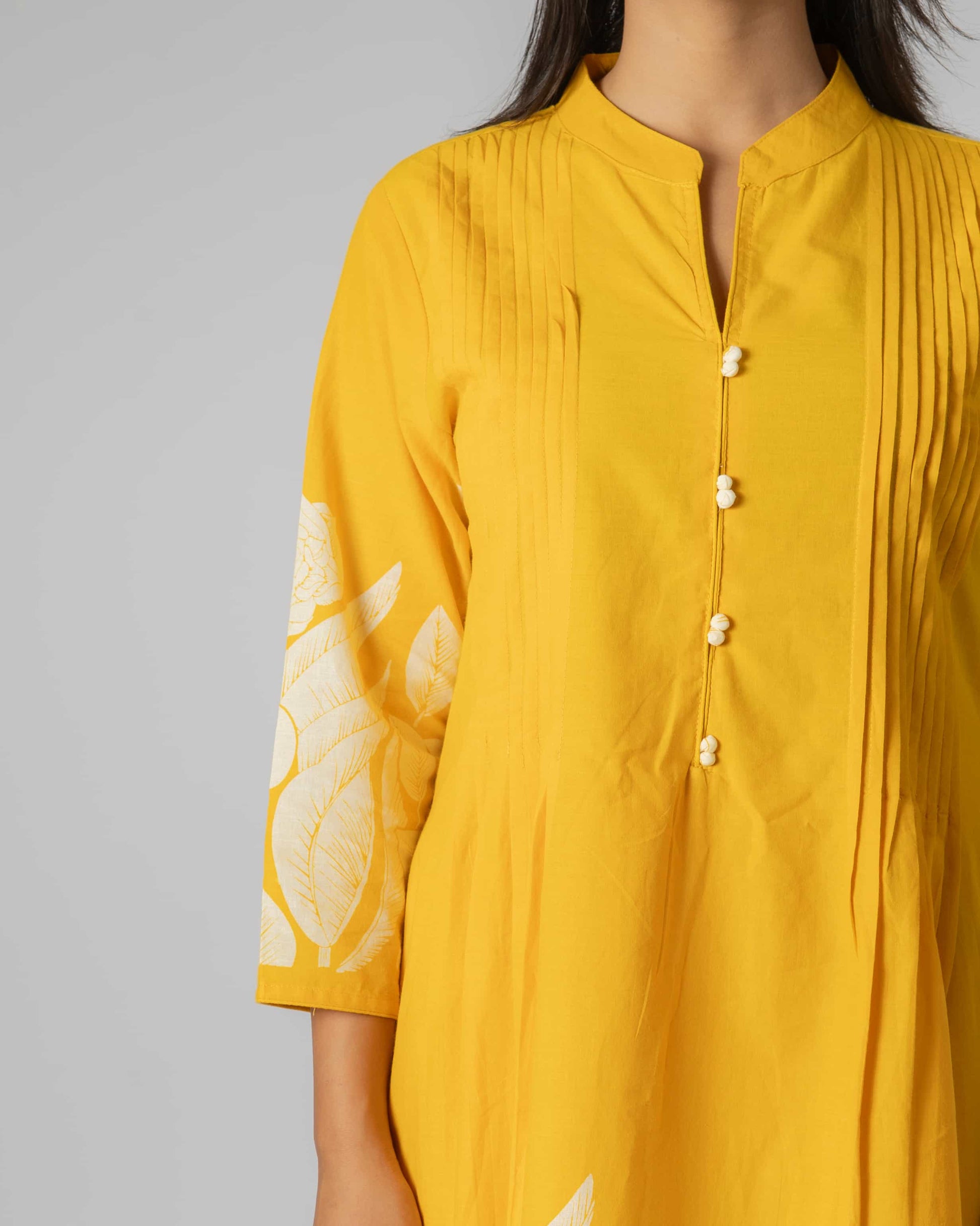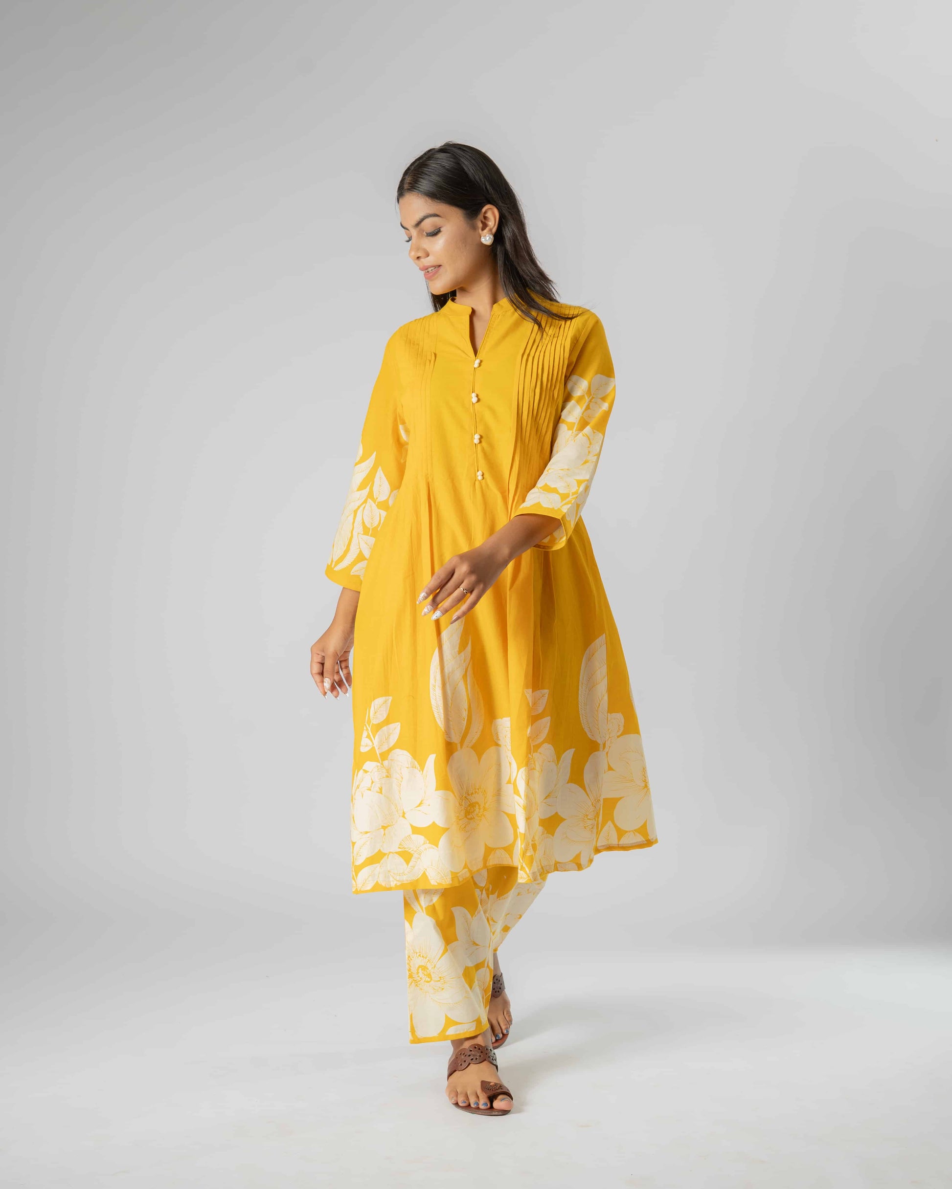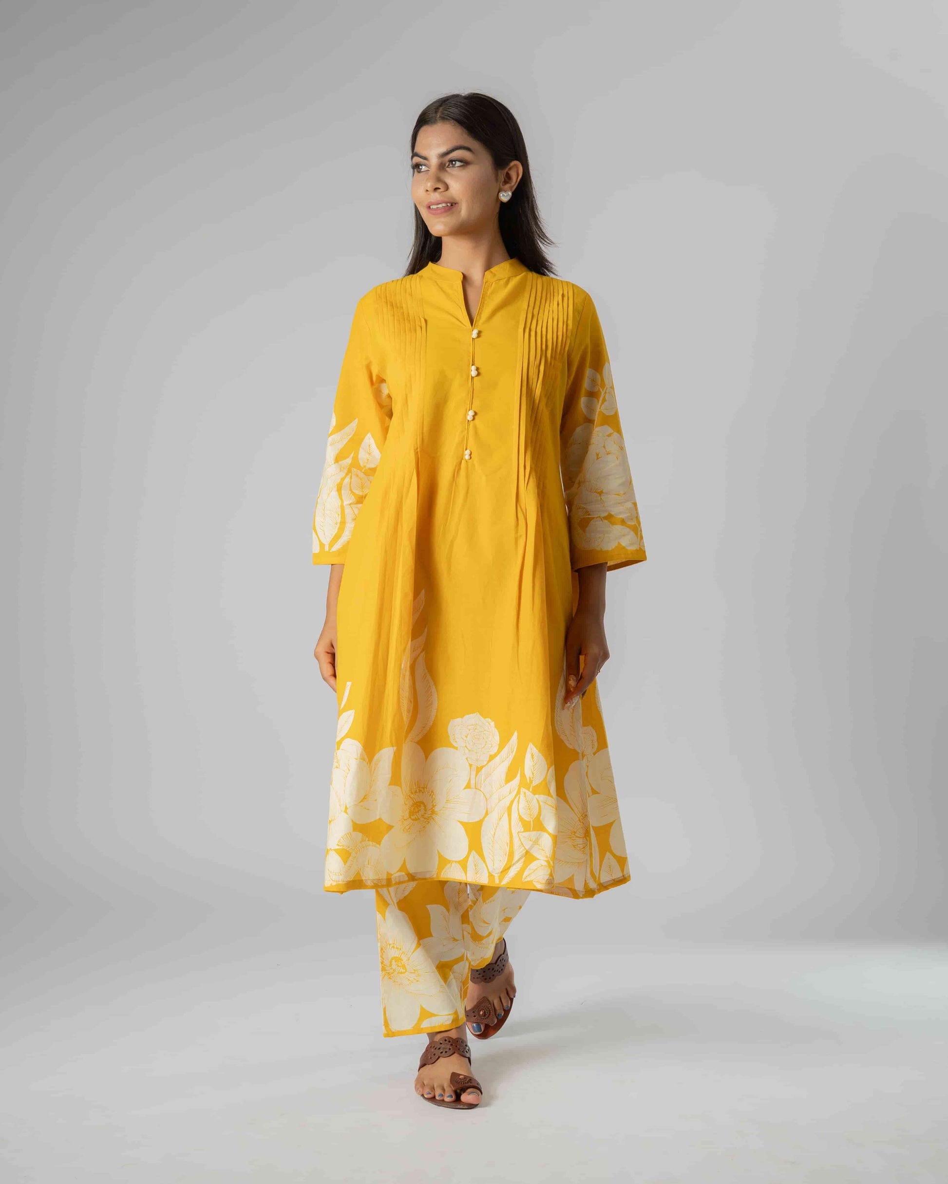 Bright and graceful, this Yellow Kurta & Pant Set is adorned with delicate white floral details along the borders. A timeless design that balances festive charm with everyday elegance.