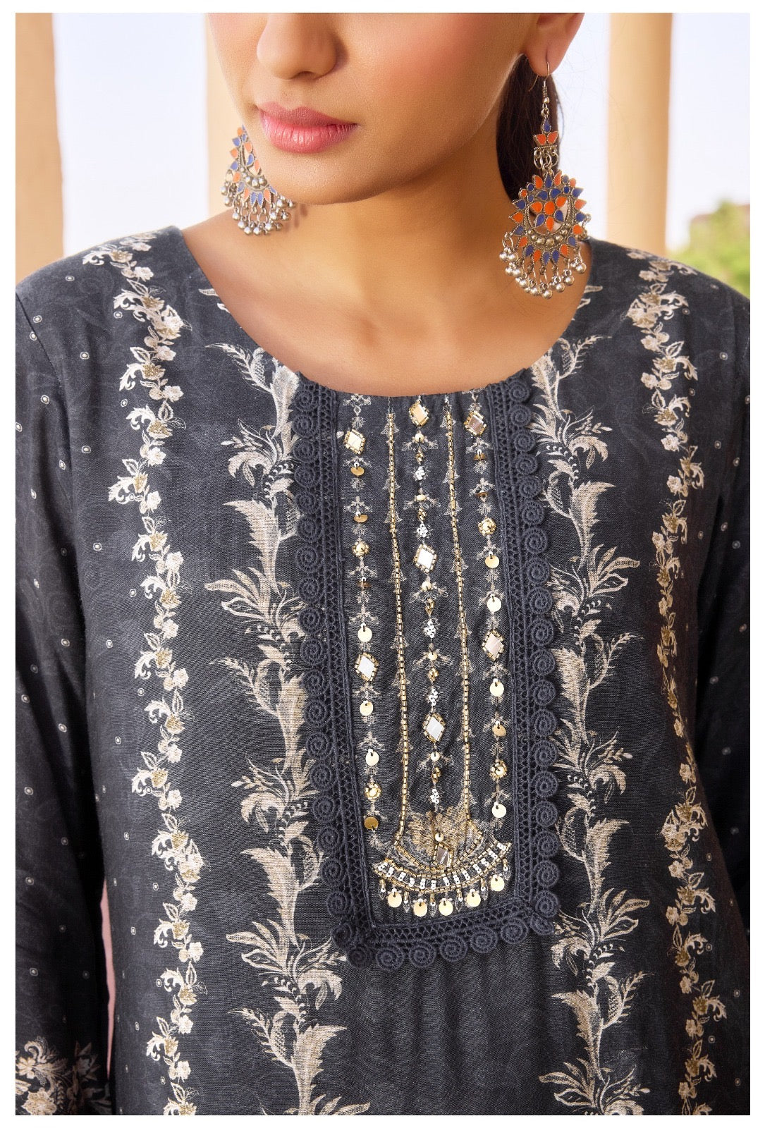 A timeless Black 3-Piece Suit Set featuring a long, elegant kurta paired with straight pants and a fluid dupatta. The elongated neckline is adorned with subtle, delicate embroidery, adding just the right touch of sophistication without taking away from its clean silhouette.